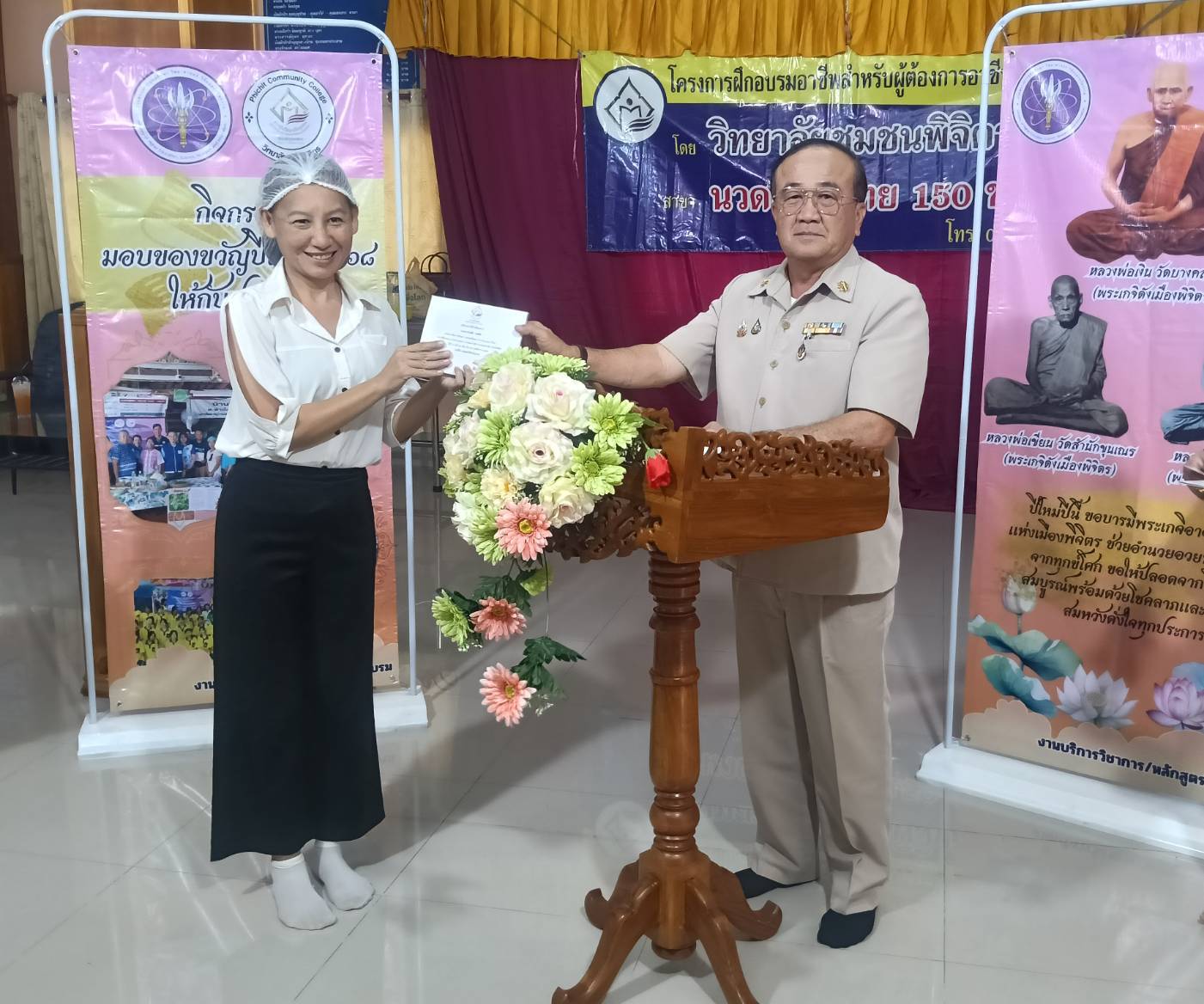 วันที่ 25 ธันวาคม 2567 นายวิชัย ชวนรักษาสัตย์ ผู้อำนวยการวิทยาลัยชุมชนพิจิตร มอบวุฒิบัตรให้ผู้สำเร็จการศึกษา หลักสูตรนวดไทยเพื่อสุขภาพ (150 ชม.) จำนวน 20 คน และเปิดให้บริการสังคมบริการนวดการกุศล คิดค่าบริการชั่วโมงละ 150 บาท โดยค่าบริการทั้งหมด จำนวน 7,420 บาท ถวายให้กับทางวัดเทวประสาท ในนามคณะนวดไทย โครงการของวิทยาลัยชุมชนพิจิตร |